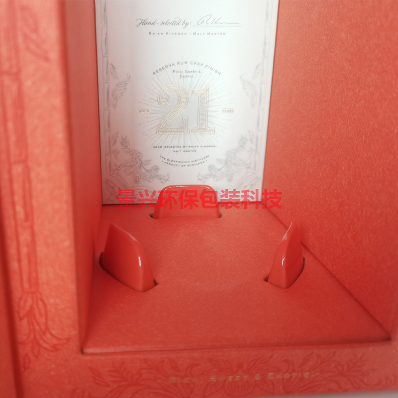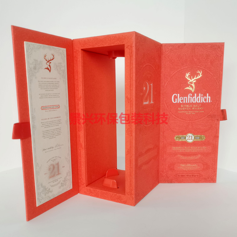 除了这些传统的印刷工艺外,客户需要再包装上增加其表现力,所以在印刷后期表面效果处理上做文章,通常印刷厂采用热冲压、热冲压、激凸、浮雕、镭射、表面植绒等,做一个高端酒盒包装,这些工艺是非常必要。