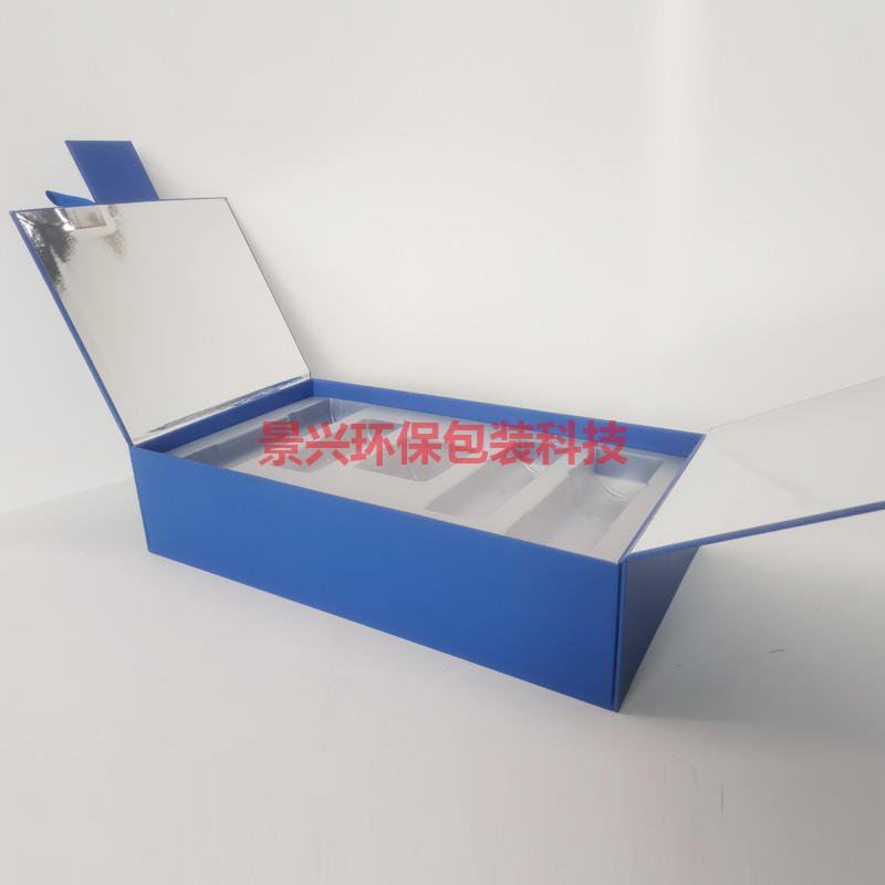 这款礼盒包装盒的设计非常简单,色彩搭配采用统一的蓝色调,但是盒型设计上与传统的包装盒存在不同,这款包装盒采用了裱纸和吸塑的方式,注意事项主要包括以下几点: